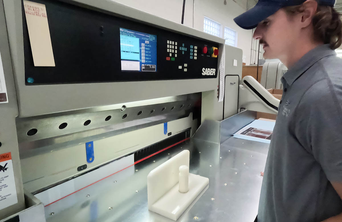 Cutting or trimming printed sheets to precise dimensions for the finished product.